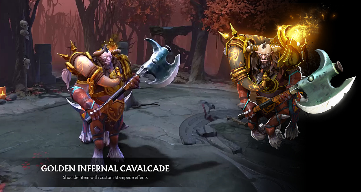 Centaur Warrunner’s Golden Infernal Cavalcade transforms his charge and stomp abilities with gilded fire effects. The golden flames create a more regal and imposing visual presence, distinguishing players who obtain this rare variant in matches.
