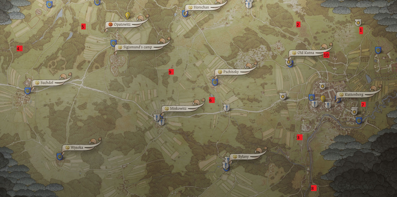 1. Woodland Hill Edge: Northwest of Rattay, this spot features a moss-covered stone seat overlooking the forest valley. The memory reveals Henry’s early hunting experiences with his father.