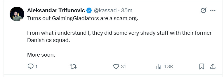 Following the controversial withdrawal, CS2 coach and analyst Aleksandar “kassad” Trifunovich publicly labeled GG a “scam organization” on X. He reached out to former CS team players, promising further revelations.