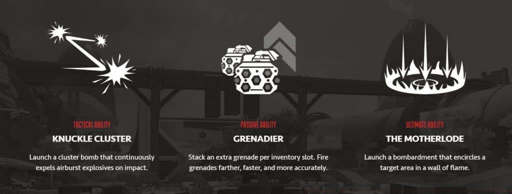 Instead of the scrapped mortar strike, Fuse launched with The Motherlode – a circular fire trap that creates area denial rather than instant elimination. This ultimate synergizes with his tactical Knuckle Cluster (a bouncing grenade launcher) and passive Grenadier ability (carrying extra grenades and throwing them farther/faster).