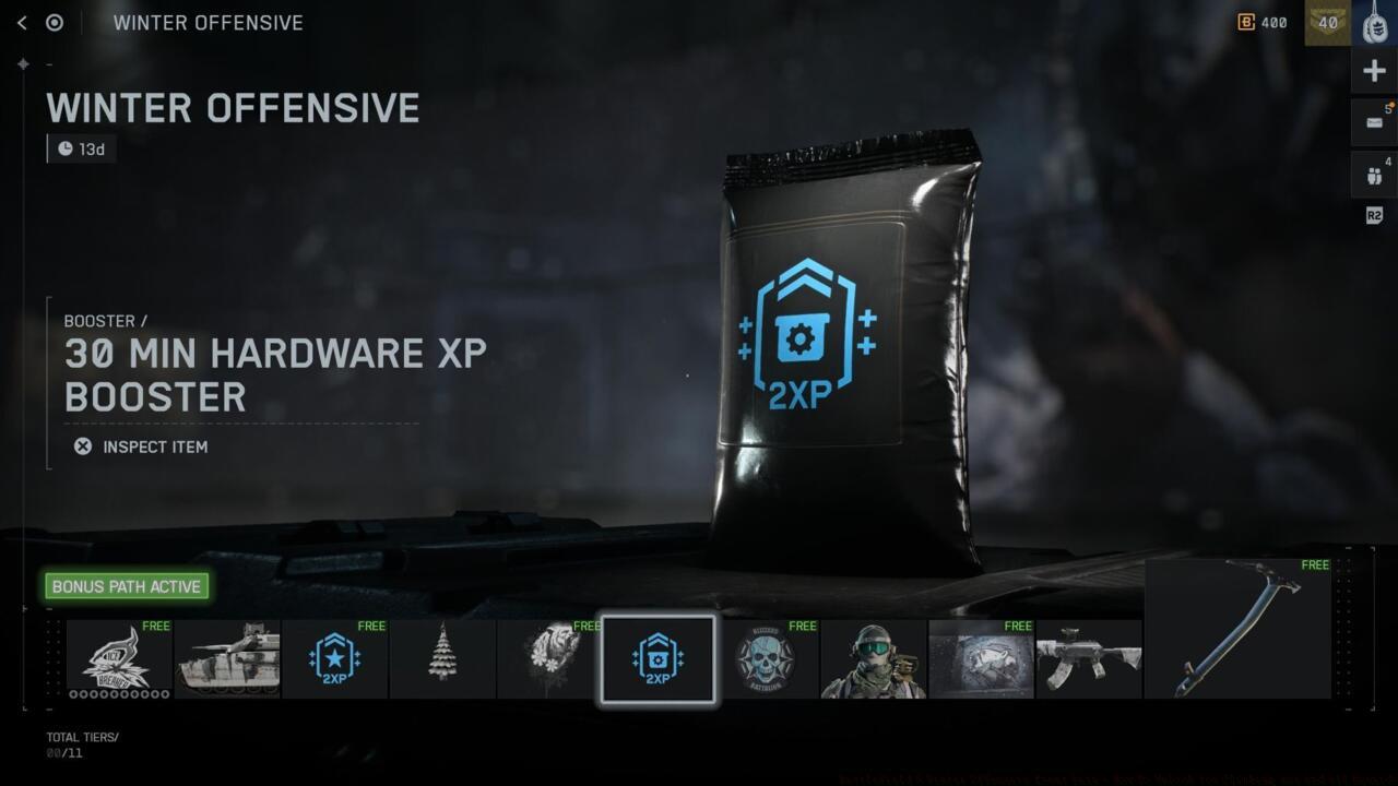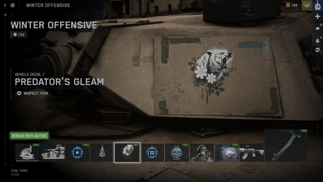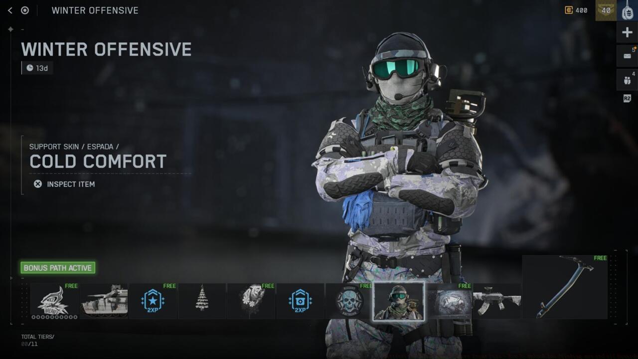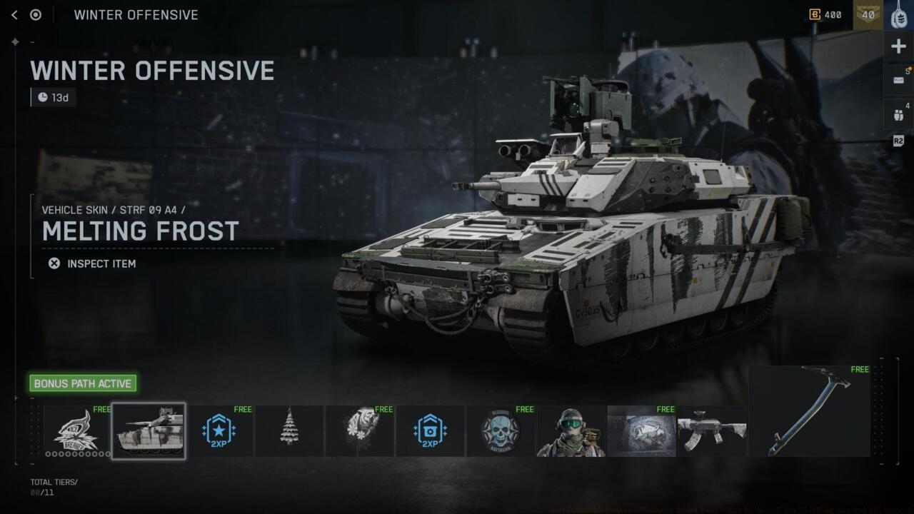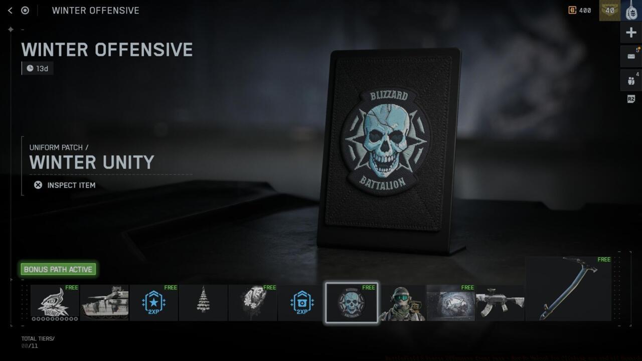 The Winter Offensive event pass operates as a separate reward track from Battlefield 6’s primary Season 1 battle pass, though both systems share menu placement under the battle pass tab. This limited-time progression path contains 11 distinct tiers of unlockable content, divided between freely accessible items and premium exclusives.