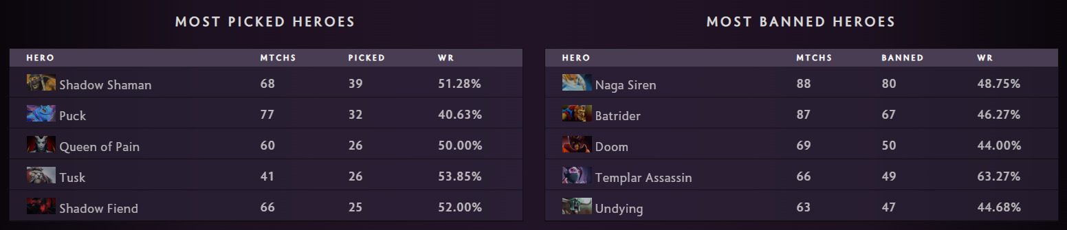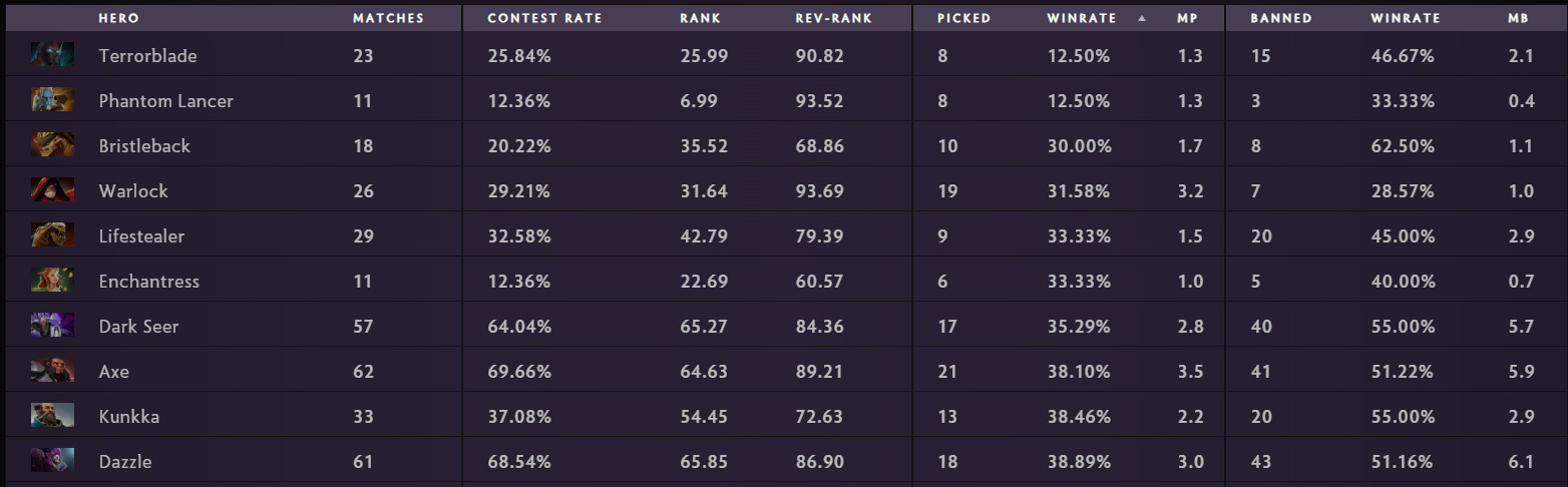 - Terrorblade and Phantom Lancer struggled severely with only 12.5% win rates each