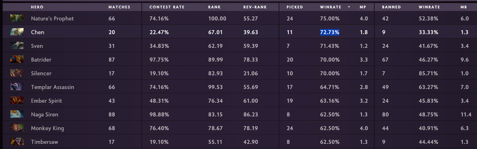 Following closely in competitive effectiveness were Chen, Batrider, Silencer, and Templar Assassin, each demonstrating strong win percentages that justified their frequent selection. These heroes shared common traits including strong laning presence, versatile skill sets, and reliable scaling into late-game scenarios.
