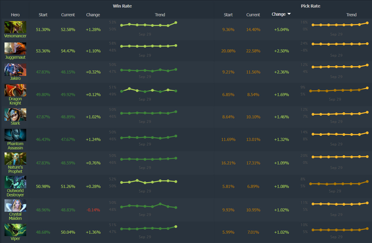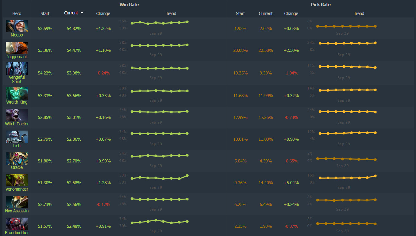 - Meepo and Juggernaut dominate with over 94% win rates despite no direct changes
