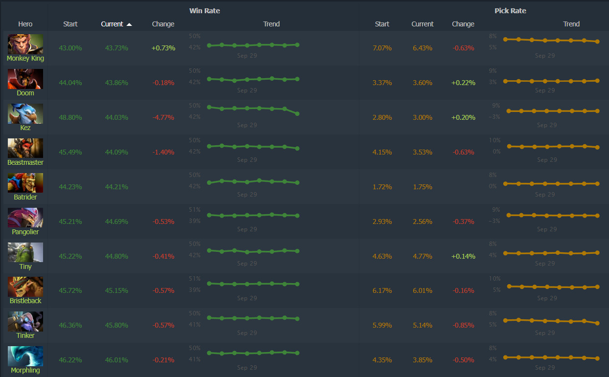 Monkey King presents one of patch 7.39e’s most perplexing statistical anomalies. Last week, he languished with a dismal 43% win rate, received significant nerfs, yet somehow gained marginal improvement. Despite this counterintuitive development, he remains anchored at the competitive bottom. Kez, freshly introduced to Captain’s Mode, suffered a dramatic decline, shedding nearly 5% of his win rate. Beastmaster represents another casualty, descending the rankings following targeted ability nerfs.