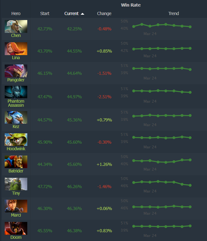 Chen continues to occupy the lowest performance tier despite community anticipation following creep domination mechanic revisions. Lina, Kez, and Batrider received various buffs, but these improvements proved insufficient to elevate them from the bottom ten rankings. Phantom Assassin experienced a reduction in Phantom Strike range capability, causing her success rate to decline to approximately 45%.
