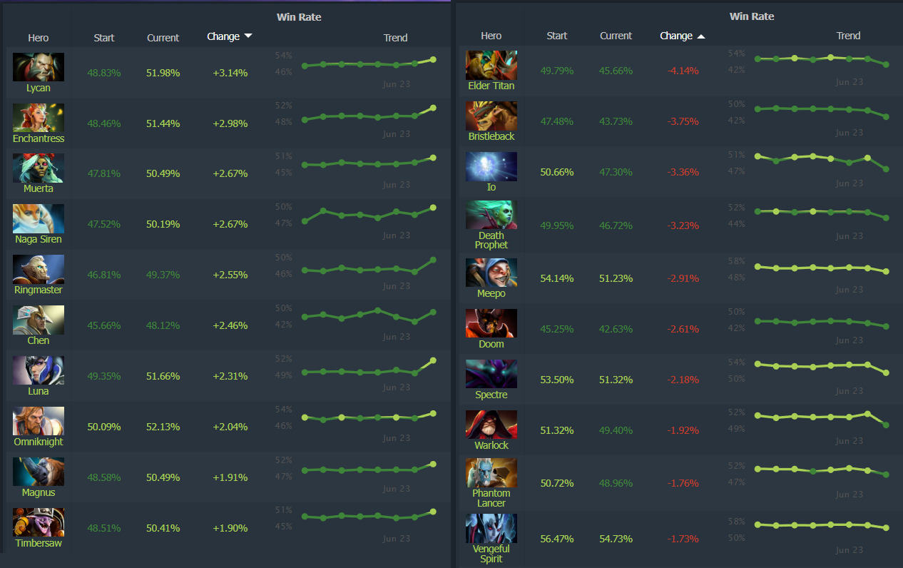 Conversely, multiple established heroes experience significant performance declines. Elder Titan, Bristleback, Io, and Death Prophet all show notable winrate reductions, indicating potential vulnerabilities in their current skill and item builds that opponents can exploit.