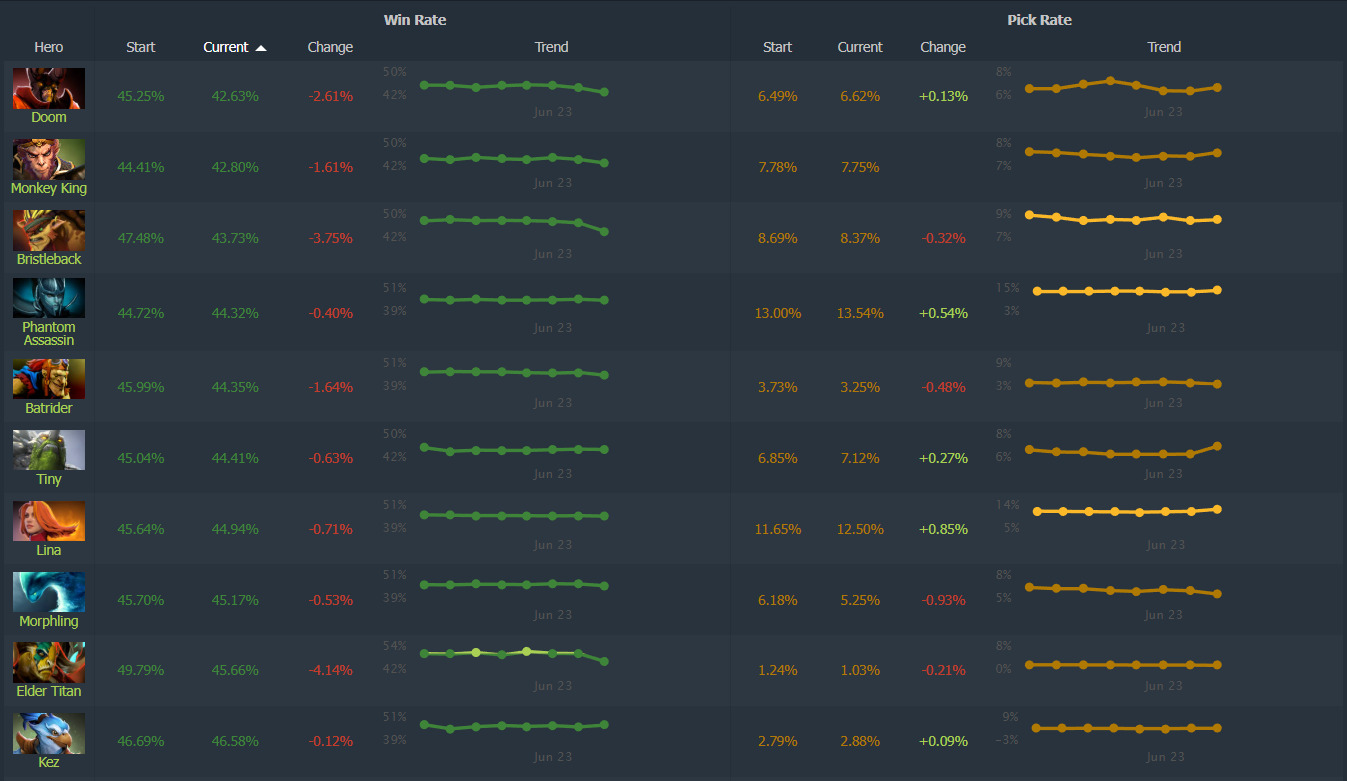 - Doom sits at bottom with 42.6% winrate following strength gain reduction