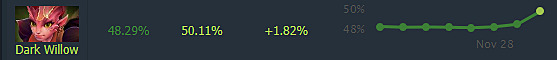 Dark Willow receives Bramble Maze enhancements, increasing damage per tick from 50 to scaling values of 50/55/60/65. This translates to total damage increases from 250 to 250/275/300/325 respectively. Already demonstrating decent performance, these improvements generated nearly 2% win rate increase as player adoption expanded.