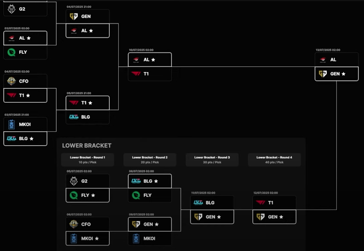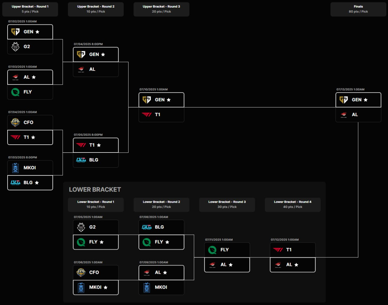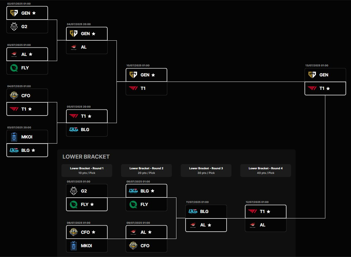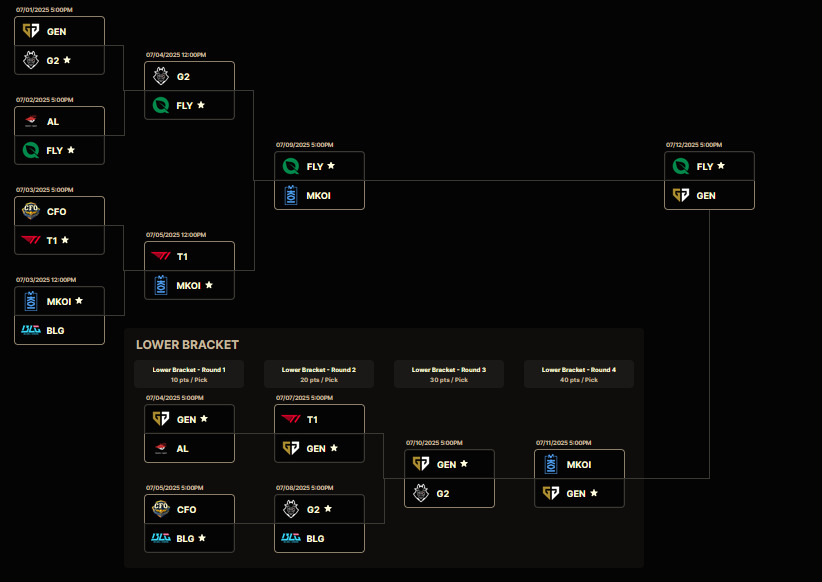 According to the official tournament timer, Pick’Em submissions will lock on July 2 at 2:15 CEST. This cutoff occurs precisely 15 minutes following the commencement of the opening playoff confrontation between Gen.G and G2, providing a narrow window for last-minute adjustments based on pre-game analysis and team preparations.