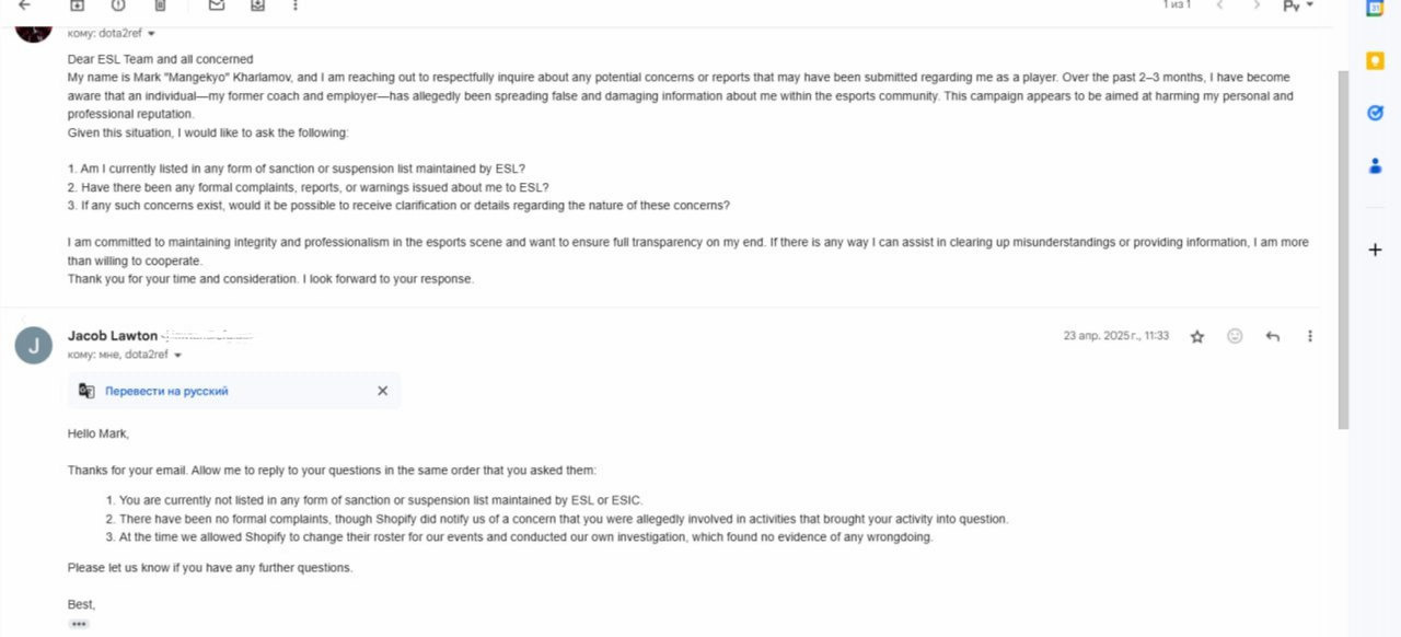 I directly approached the tournament organizers myself. They verified that Bulba requested my disqualification based on match-fixing allegations. The TOs conducted thorough investigations but discovered no evidence supporting claims of competitive integrity violations. Both ESL and PGL organizations maintain no competitive sanctions against me. Therefore, all statements Bulba made were demonstrably false.