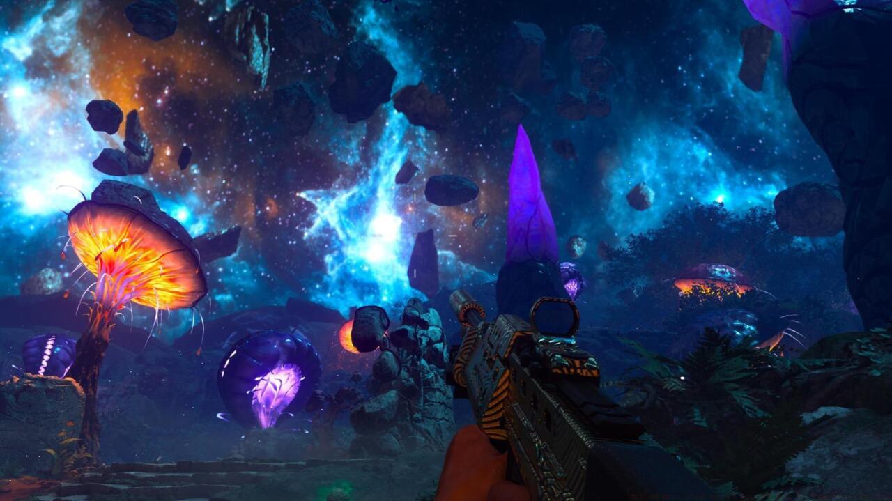 Progress from the scarlet portal in the direction of the amber gateway, where the concluding headset rests on the terrain adjacent to a luminous fungal growth. This glowing marker serves as a valuable visual cue in the otherwise chaotic environment.
