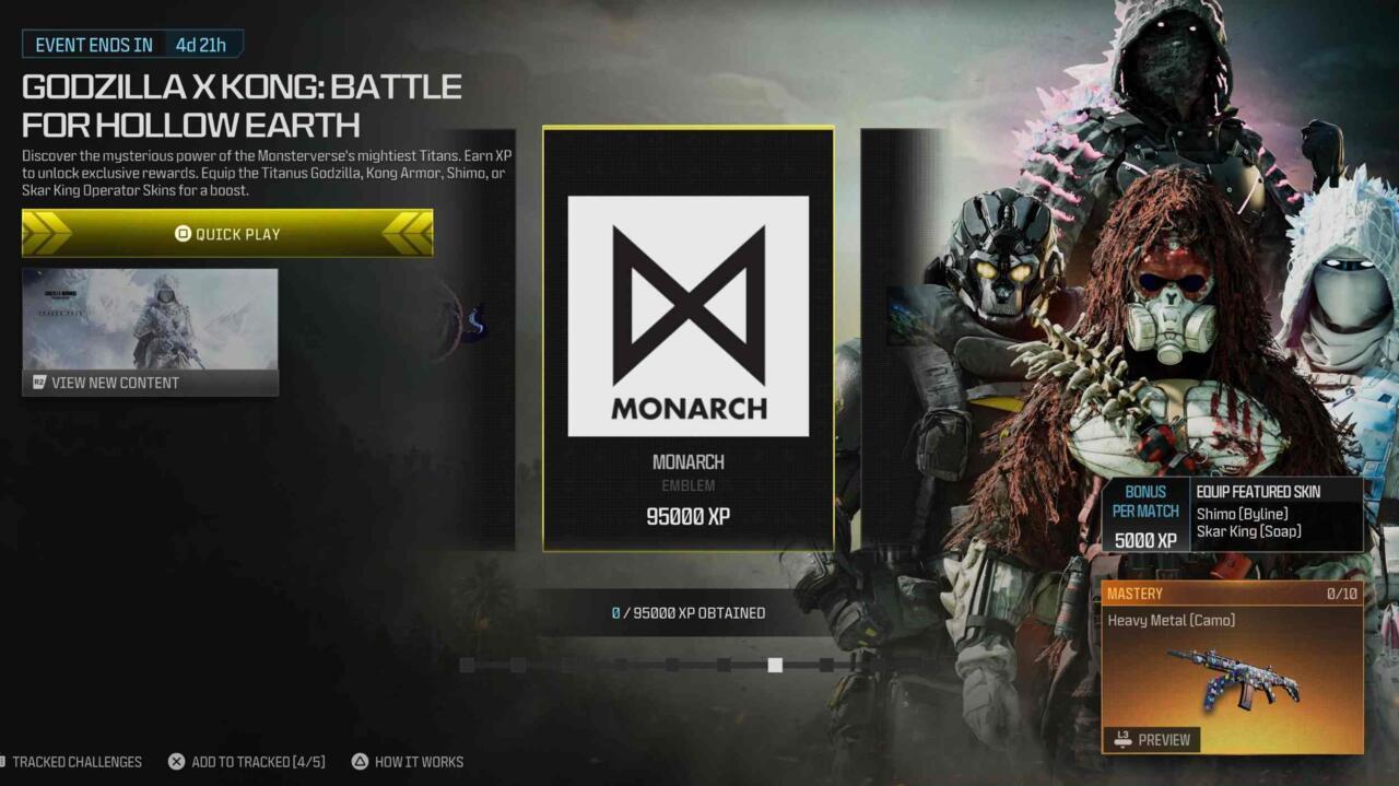 The prestigious Monarch emblem becomes available at 95,000 XP, allowing you to display the iconic organization logo from the Monsterverse on your player profile. This item signifies your dedication to mastering the event’s challenges.