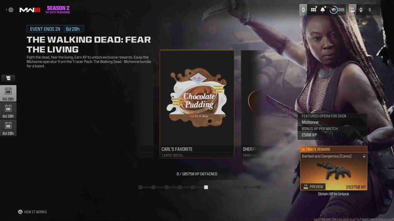 At 105,750 XP, players obtain the Carl’s Pudding weapon sticker, referencing the memorable scene where the young survivor discovers preserved pudding during the apocalypse.