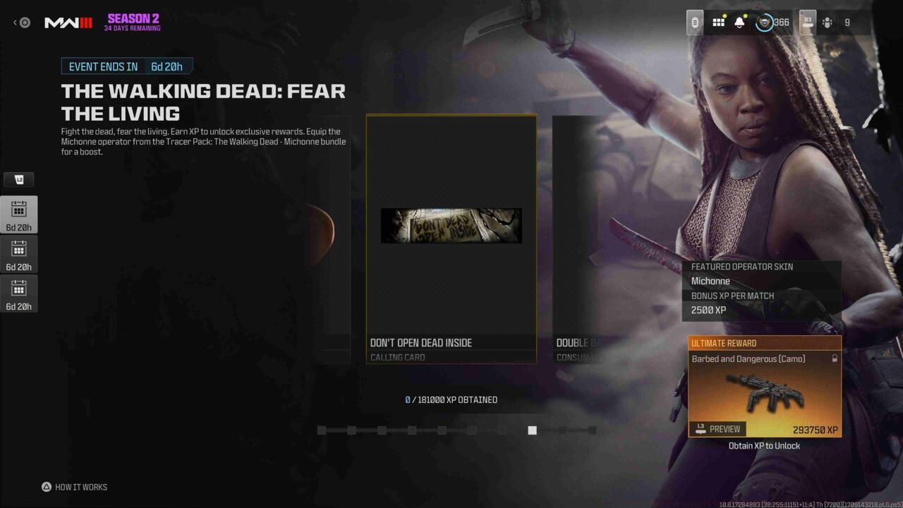 Completing the event at 181,000 total XP delivers the “Don’t Open, Dead Inside” calling card, featuring one of the series’ most hauntingly memorable phrases displayed prominently on your player profile.