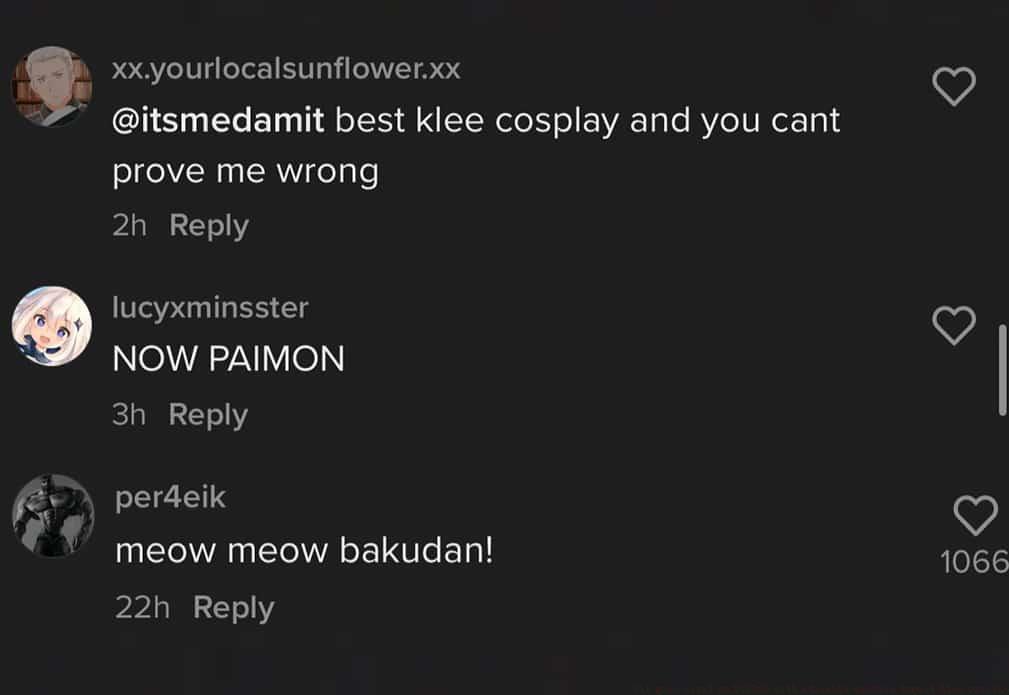The TikTok platform immediately embraced the creative interpretation, with viewers expressing overwhelming appreciation through comments and shares. One enthusiast declared it the definitive Klee portrayal, stating no alternative could surpass this feline version. Additional comments requested expanded character portrayals, with particular emphasis on companion character Pimon. Devoted fans creatively adapted Klee’s signature explosive catchphrase, transforming “Boom Boom Bakudan” into an appropriately feline-themed “meow meow Bakudan” variation.