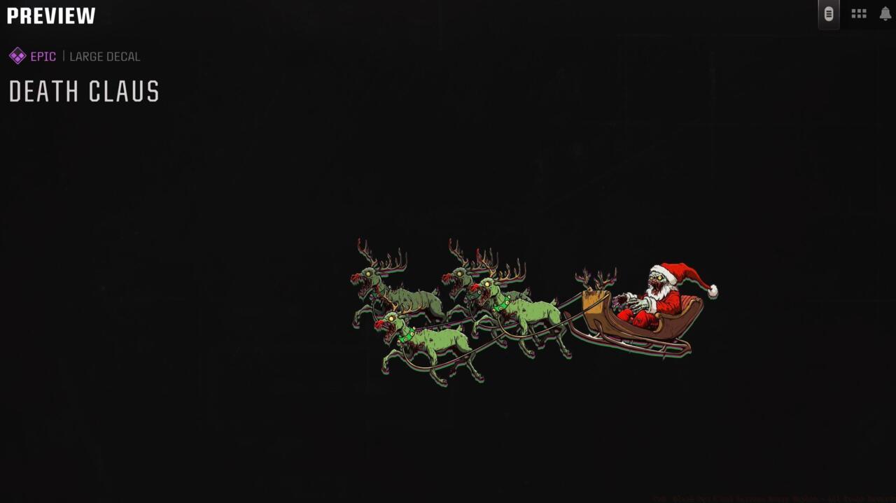 Death Claus emerges as a large decal option at higher XP thresholds, allowing for substantial cosmetic customization of your weaponry and equipment.