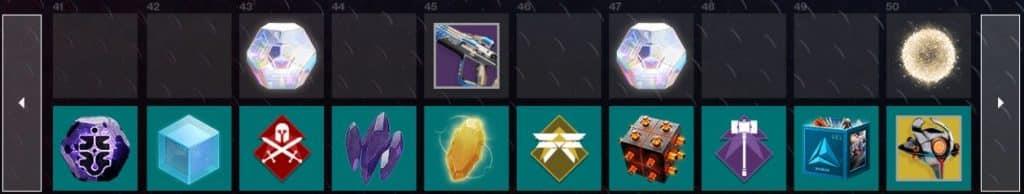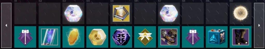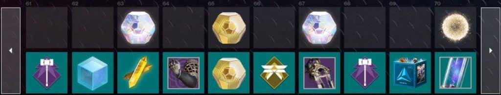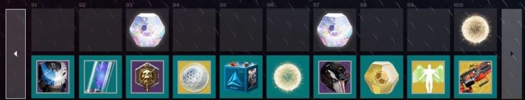 Examine the comprehensive reward progression below, featuring the standard assortment of experience buffs, cosmetic shaders, seasonal armor sets, and upgrade materials, alongside the headline Grand Overture exotic weapon.