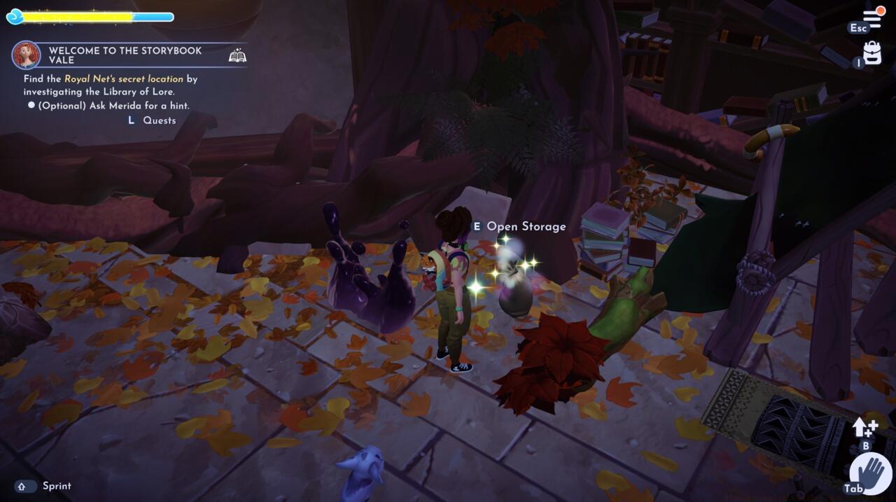 Upon arriving in The Storybook Vale, you’ll immediately notice the linear pathway design. Proceed forward to discover Merida encircled by swirling magical ink formations—referred to colloquially as “inkies” by the game community. These obstructions function identically to night thorns and splinters of fate that you’ve previously encountered.