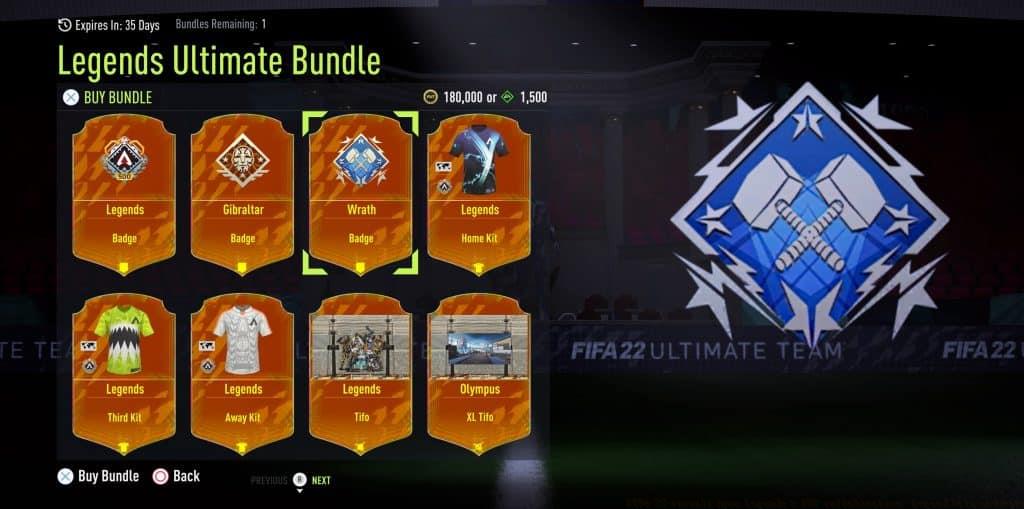 Detailed overview of available items in the FIFA 22 and Apex Legends collaboration bundle. The complete Apex Legends customization package in FIFA 22 is currently accessible through the in-game store.