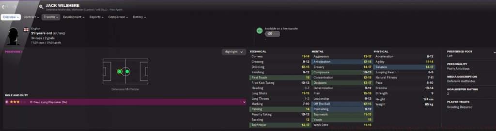 Can you keep Wilshere fit and playing? Jack Wilshere represents the classic high-risk, high-reward free agent signing. His technical attributes remain impressive with first touch (16), passing (15), and vision (14) making him an effective creative force. However, his natural fitness (6) and injury proneness (16) require careful management through customized training schedules and limited match exposure.