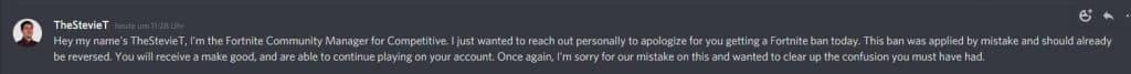 Noahreyli/TwitterOfficial communication from Epic Games confirming the erroneous ban
