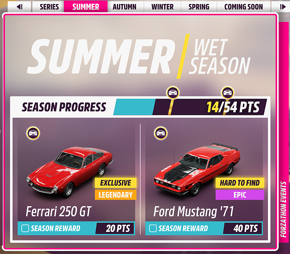 The Forza Horizon 5 seasonal festival system represents one of the game’s most engaging features, offering monthly rotating challenges, competitive events, and exclusive rewards. Our comprehensive guide provides carefully selected vehicle recommendations, proven tuning configurations, and strategic approaches to maximize your efficiency. Some seasonal objectives present significant difficulty spikes that require specialized preparation! To unlock the initial premium reward, the coveted Ferrari 250 GT, you must accumulate 20 Seasonal Points. The secondary reward, the 1971 Ford Mustang, becomes available once you reach 40 points total.