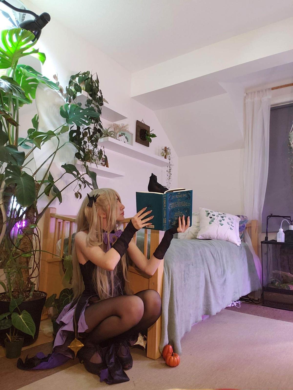 In multiple photographs, the cosplayer accurately reproduced Fischl’s characteristic stances from the role-playing game while positioned beside a full-scale replica of the heroine’s nocturnal raven companion, Oz. Glori ingeniously incorporated literary elements by holding a book to represent the character instructing her familiar in literacy, adding narrative depth to the visual presentation.