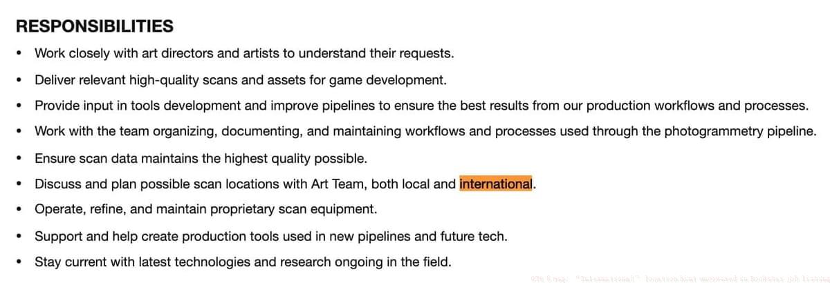 The employment description explicitly states: “Coordinate and strategize potential scanning destinations with Art Department personnel, encompassing both domestic and international locations.”