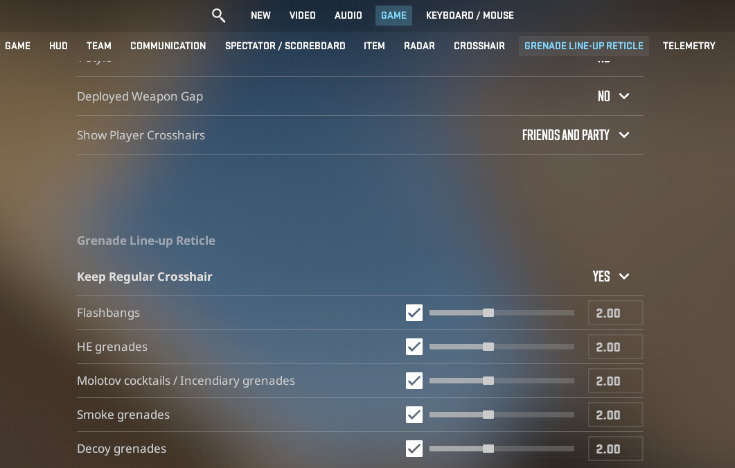 Following pin removal, the standard two-second delay before reticle appearance may not suit aggressive, fast-paced strategies. Fortunately, CS2 provides comprehensive customization options for this feature. Navigate to Settings > Game tab and locate the “Grenade Line-up Reticle” configuration panel.