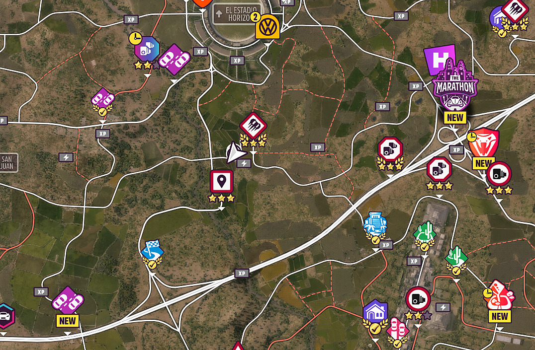The Horizon 4 Festival Site occupies a distinct position within Tierra Prospera, situated directly south of the massive El Estadio Horizon stadium complex. Alternatively, approach from the west relative to the major intersection dominating the central portion of the map. The site integrates seamlessly into one of the sweeping curves within the Mountain Top Drift Zone, featuring prominent visual elements that make identification straightforward.