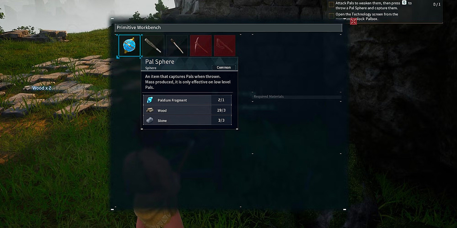 - Create Pal Sphere at any Workbench using 3 x stones, 3 x wood and 1 x Paldium Fragment
