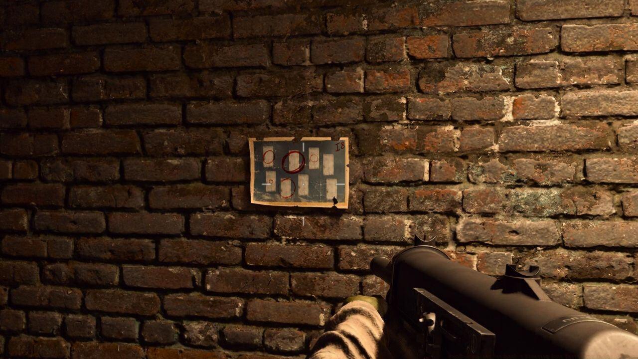 Execute the shooting sequence exactly as depicted on your recorded document. Each door must be struck in the proper order using any weapon in your inventory. Incorrect sequencing will reset the process, requiring a return to Prison to obtain the clue again.