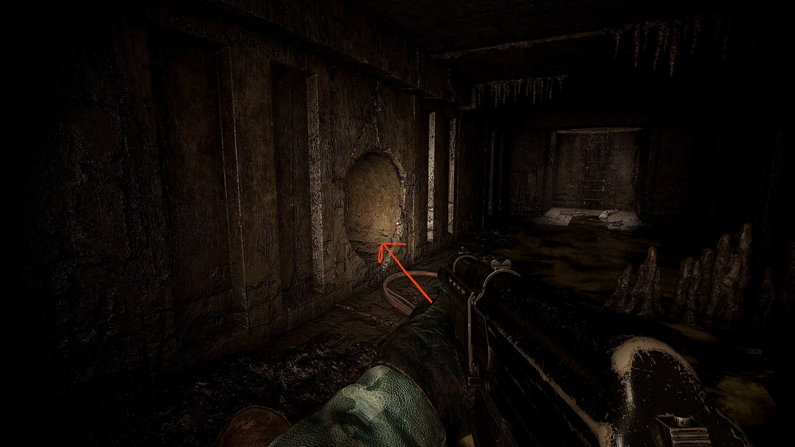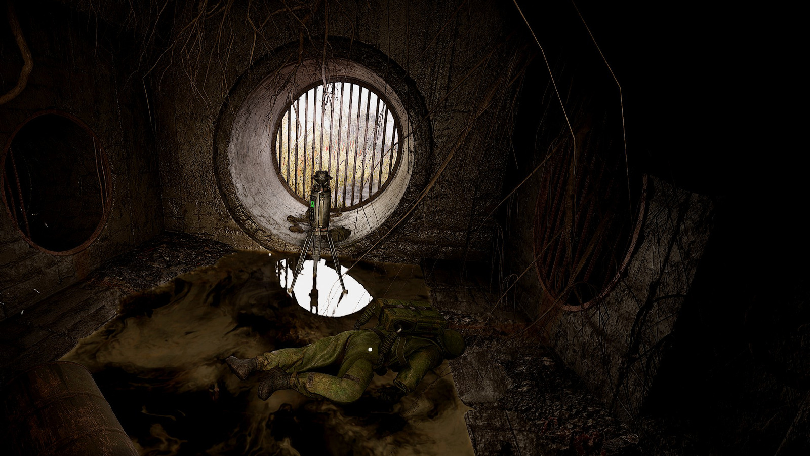Identify the sewer egress point featuring compromised barrier fencing. Upon entry, proceed along the left-side conduit where you’ll discover both the scanning mechanism and a deceased researcher with accompanying equipment.