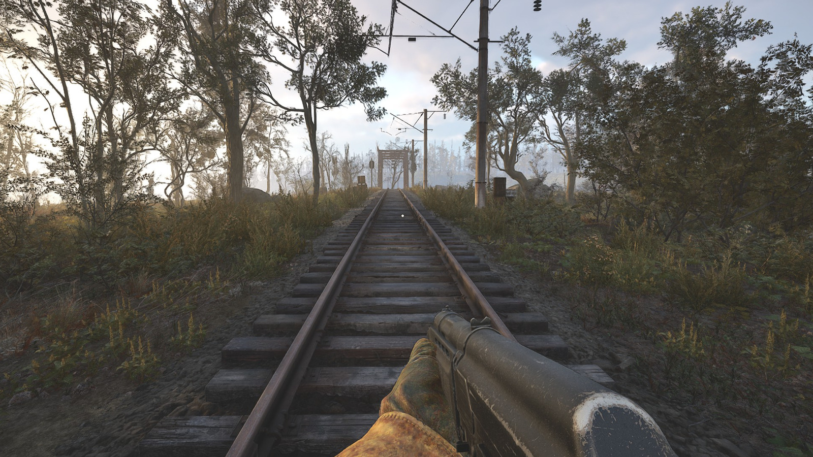 Proceed from the train carriage toward the island following the railway alignment. Eliminate zombified stalkers positioned along both rail sides before initiating the scanning mechanism.