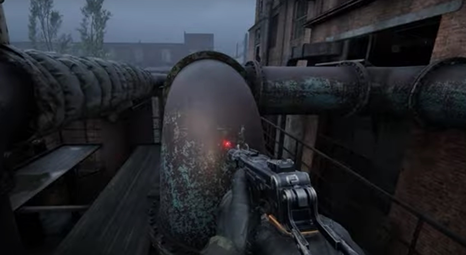Identify the distinctive red brick structure within the complex. Adjacent to this building, you’ll discover a network of pipes mounted on an elevated platform. Ascend to the upper level, carefully traverse along the side rail, and make the calculated jump onto the pipe system as demonstrated in the reference image. Your objective is reaching the window positioned to the right side of this arrangement.