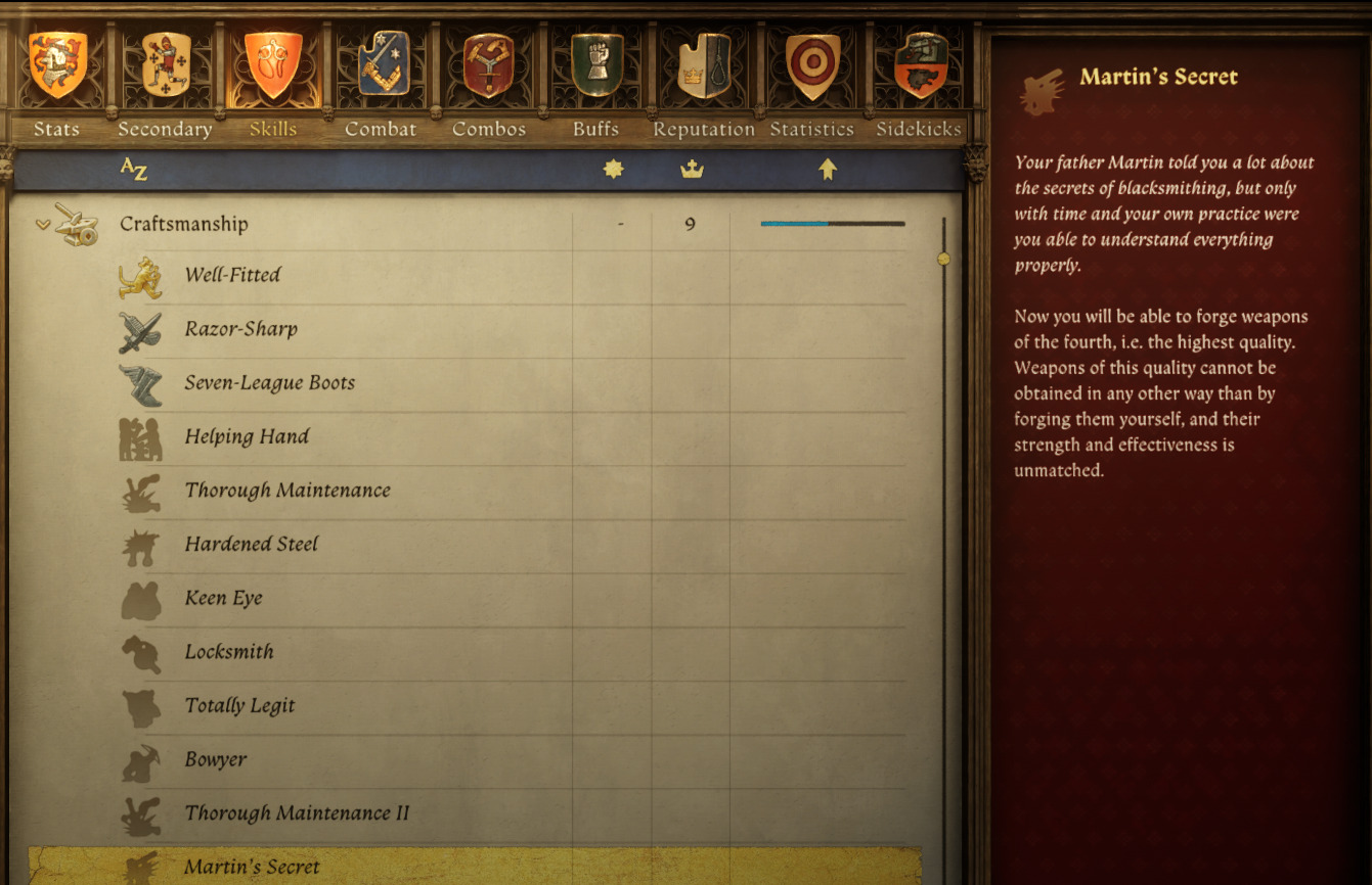 To create weapons transcending normal quality boundaries, you must first achieve Crafting Level 16 and acquire the specialized Martin’s Secret ability. This perk’s description explicitly indicates it enables production of the finest possible armaments available through player crafting.