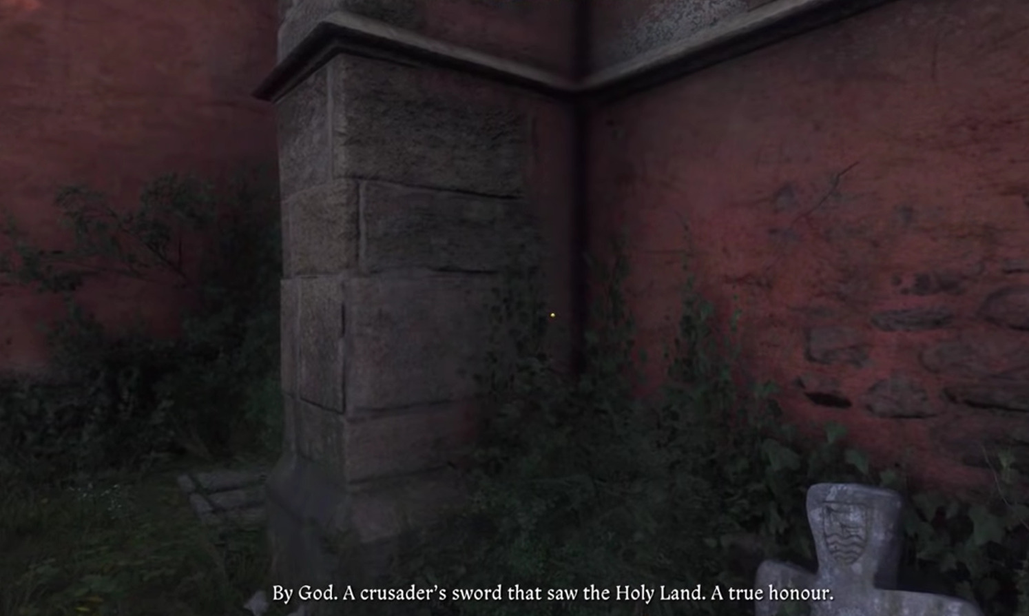 Progress through the storyline until you discover Boleslav’s final resting place. The gravesite is strategically positioned adjacent to the monastery perimeter wall, cleverly concealed by overgrown foliage that requires careful inspection to locate. Upon accessing the burial chamber, you’ll retrieve the sword directly from the deceased knight’s remains.