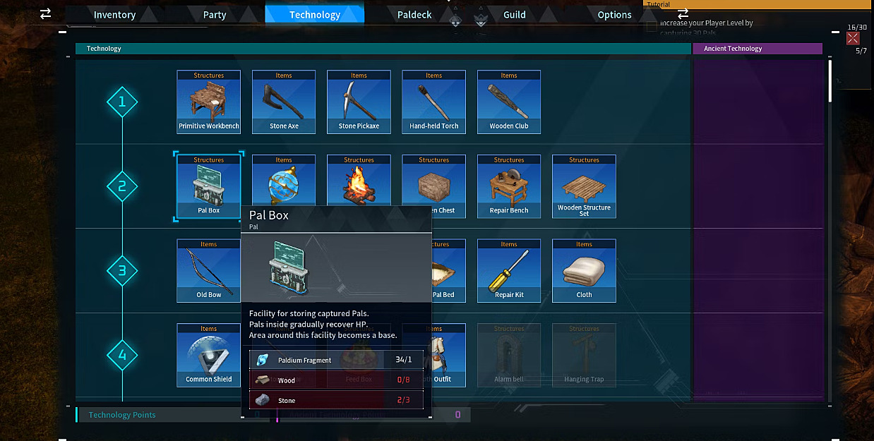 Initiate construction by deploying the Palbox, your foundational structure that defines the base perimeter. This blueprint becomes accessible upon reaching Level 2 in the Technology tree and requires just one Technology Point to unlock. The initial material requirements are modest: 1 Paldium Fragment, 8 Wood, 3 Stone. These basic components are readily available throughout the game world.