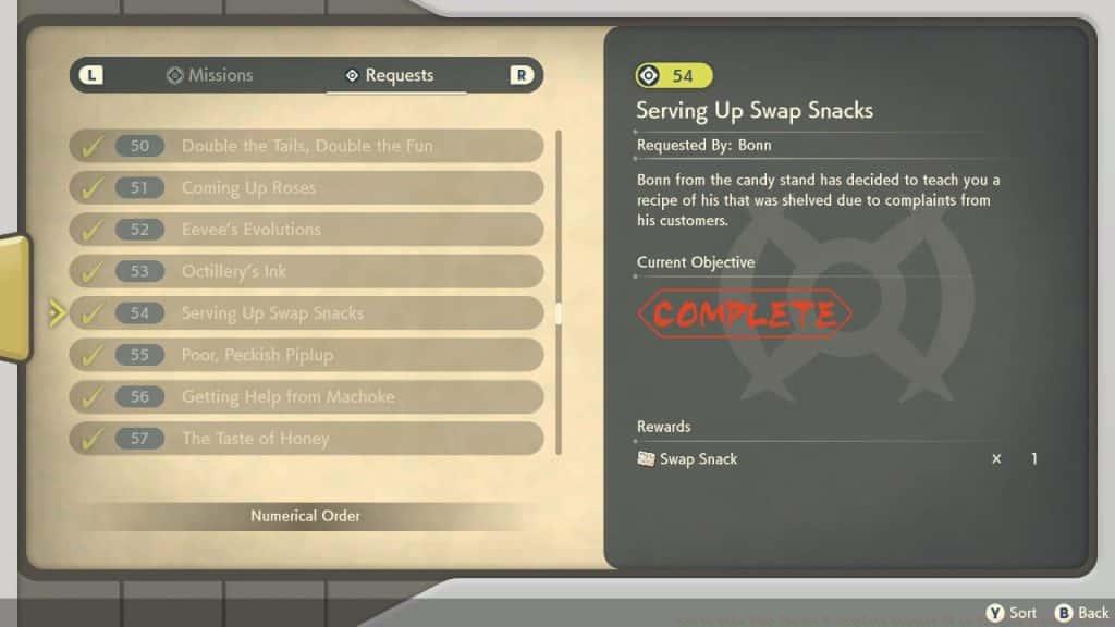 GameFreakCompleting Request 54 will earn players the Swap Snack crafting recipe. He will reward you with one Swap Snack and permanently unlock the crafting recipe. The recipe requires one Candy Truffle in addition to the three collected ingredients, so ensure your inventory contains this fourth component for future crafting sessions.