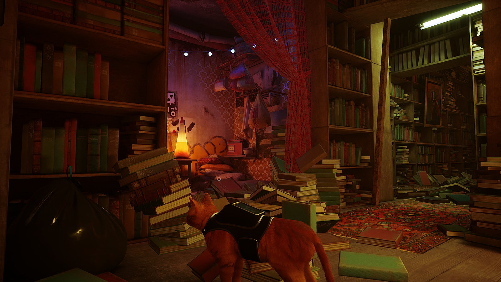 Many players overlook this area due to the natural appearance of the book barrier, which seems like typical environmental decoration rather than a deliberate pathway obstruction. Approach from the eastern section of the main library hall and look for a subtle gap in the literature wall that permits feline access. The key itself appears as a metallic object with distinctive engraving, resting conspicuously on the bedding material once you breach the chamber.