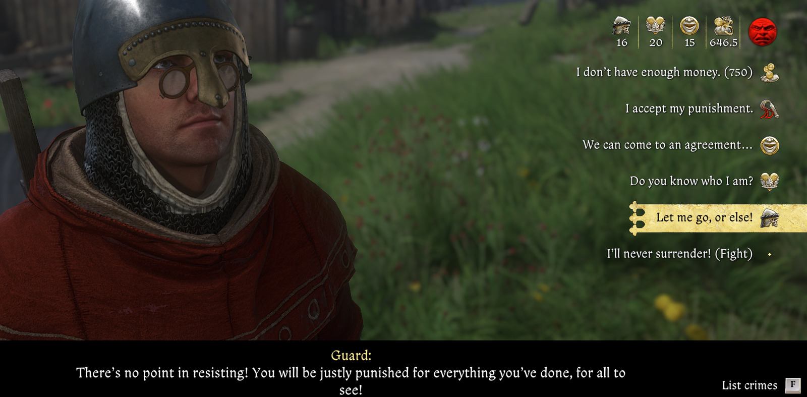 Fortunately, Warhorse Studios implemented a comprehensive crime review feature that’s easily accessible during detention sequences. When the arrest dialogue interface appears on screen, immediately press the F key to display the complete catalog of your offenses. This critical function often goes unnoticed because the prompt typically displays on the left edge of the interface, making it easy to overlook during tense arrest scenarios.