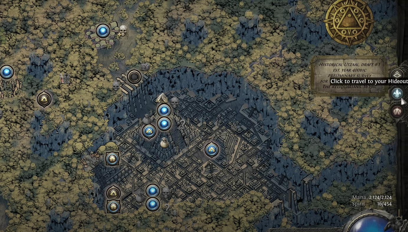 - Locate hideout icons: Scrutinize the Atlas interface for distinctive hideout markers, which predominantly appear within the initial 10 mapped areas of your endgame journey