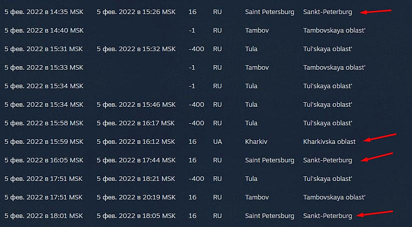 SmN supplied comprehensive account activity logs. February 5 records demonstrate three distinct login sessions originating from St. Petersburg, corresponding with Sensibility’s verified residence. One additional login originated from Kharkiv location. SmN believes Sensibility distributed his account credentials to additional parties.