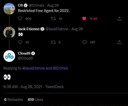 Cloud9 founder and CEO Jack Etienne deepened the intrigue by engaging with free agency announcements from Ian ‘Crimsix’ Porter, Call of Duty’s most accomplished competitive player. Etienne’s use of the eyes emoji response suggests serious roster consideration rather than casual social media engagement.