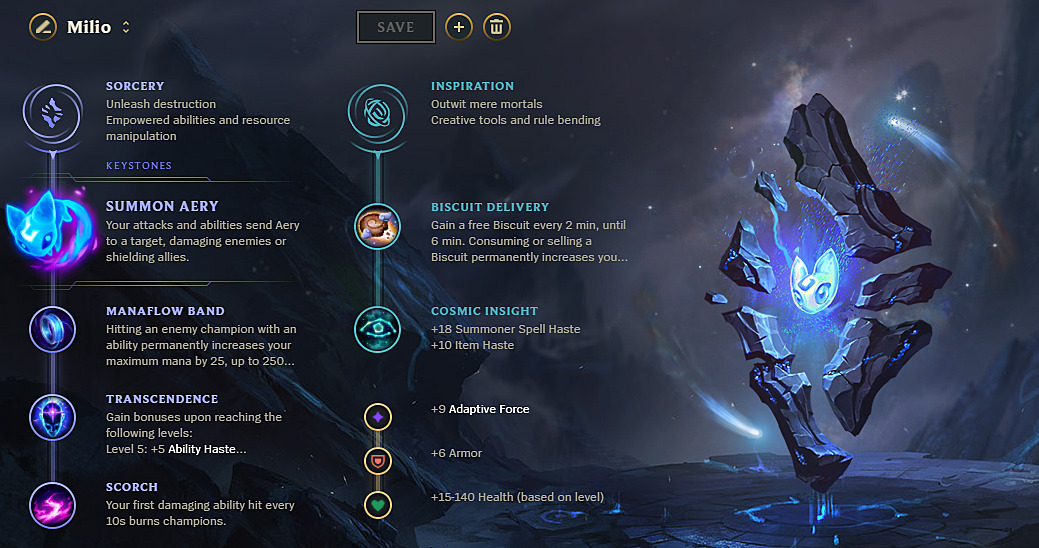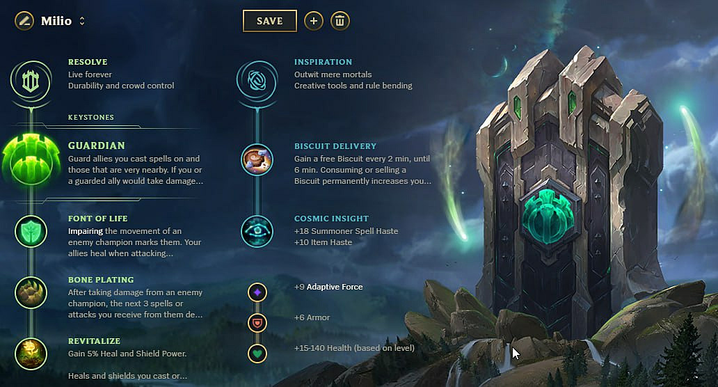 Milio accommodates two distinct rune configurations tailored to different playstyles and team compositions. The Summon Aery setup enhances your poke damage and shielding effectiveness, while the Guardian path strengthens your defensive capabilities and survivability. Both builds offer flexibility in secondary rune selection, allowing adaptation between armor, health, or adaptive force based on lane matchups.