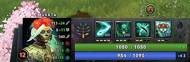 - Muerta excels as magical damage carry but requires item advantage to dominate