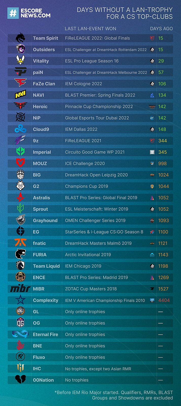 - Complexity Gaming holds the longest LAN drought at 4000+ days since their last CS 1.6 championship