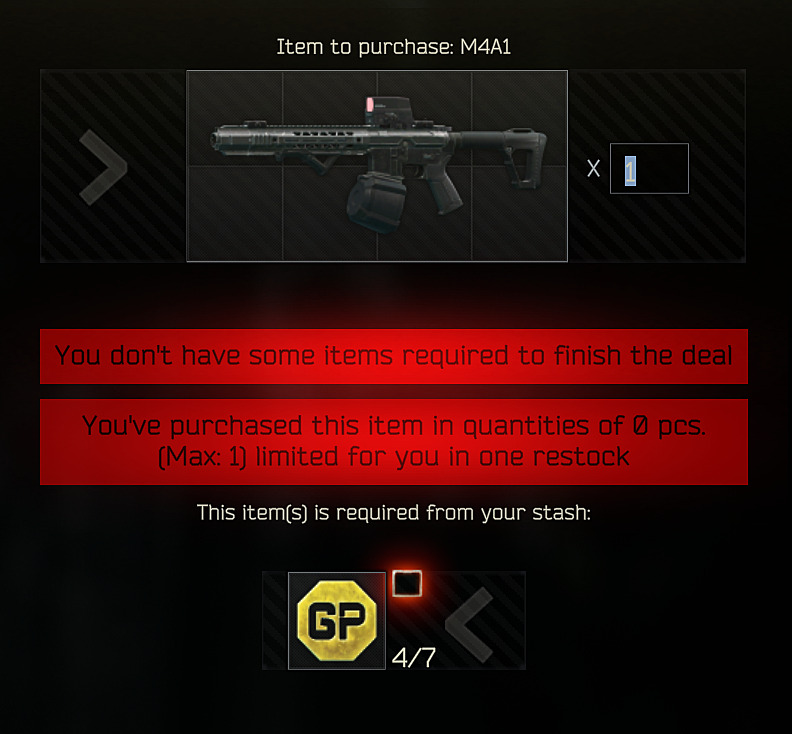 For the Steiner LAS/TAC 2 flashlight, current flea market prices remain reasonable, but Mechanic LVL2’s gun barter trade provides insurance against price spikes. This exchange demands 7 G-coins for an M4 SAI build package, from which you extract the flashlight component.