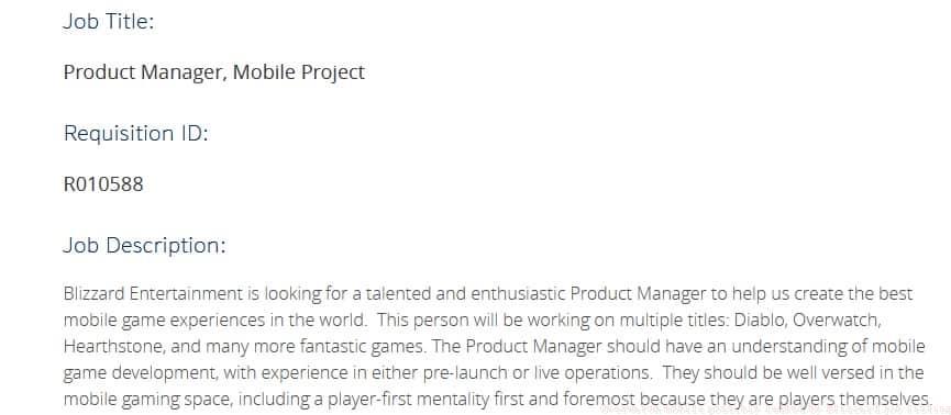 The “Product Manager” position listing specifically references Overwatch alongside other established mobile titles within the official job responsibilities description.
